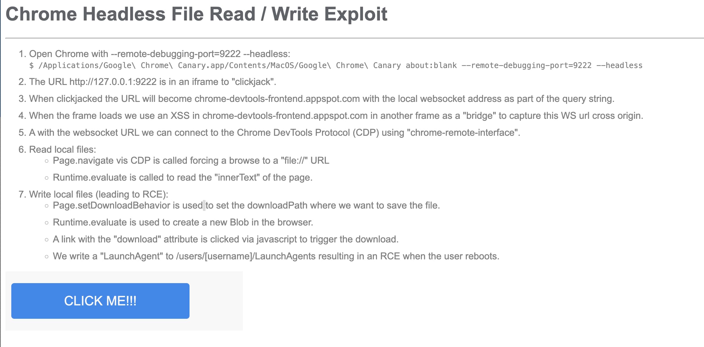 /Applications/Google\ Chrome.app/Contents/MacOS/Google\ Chrome --headless --remote-debugging-port=9222Open the exploit HTML file (